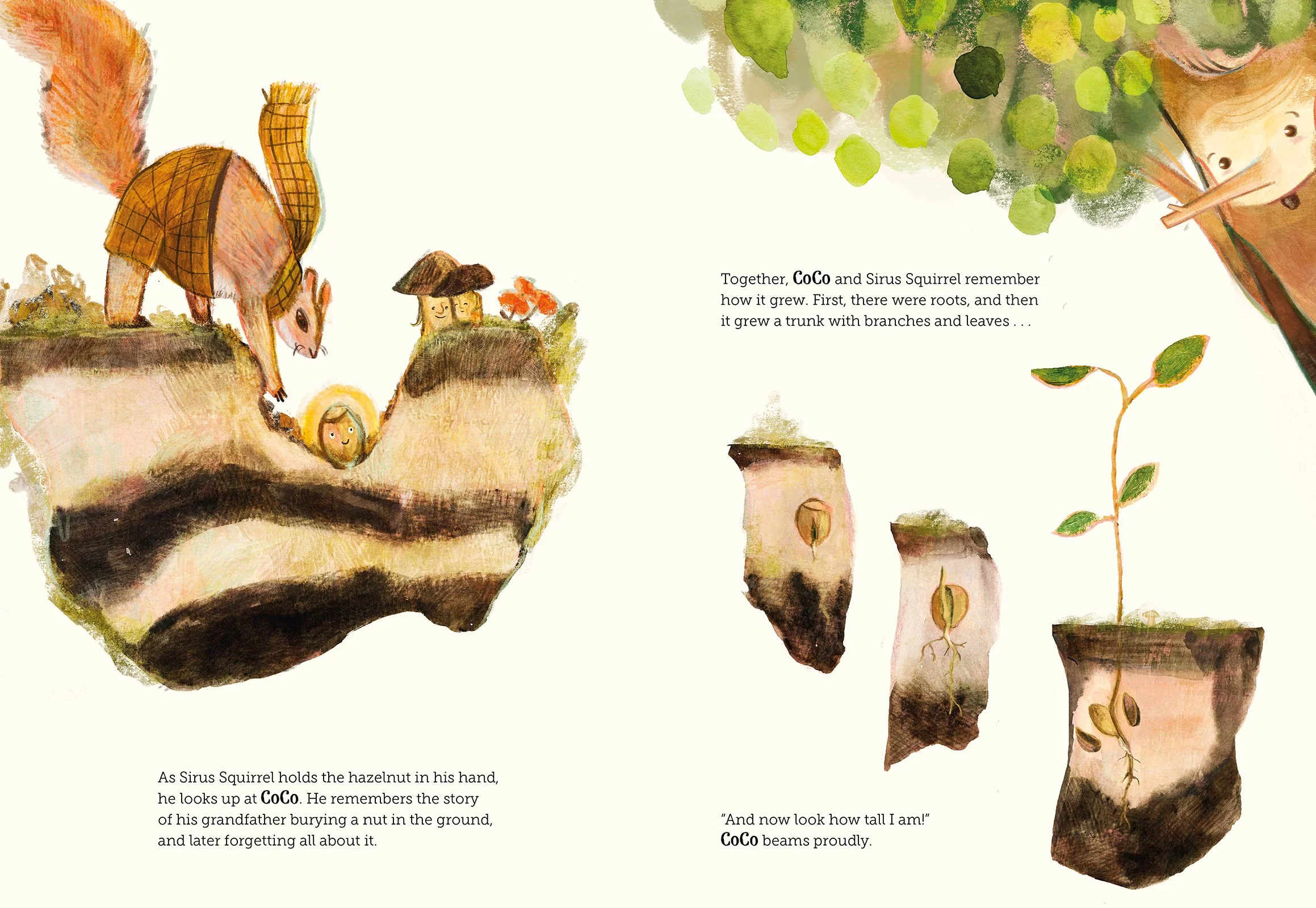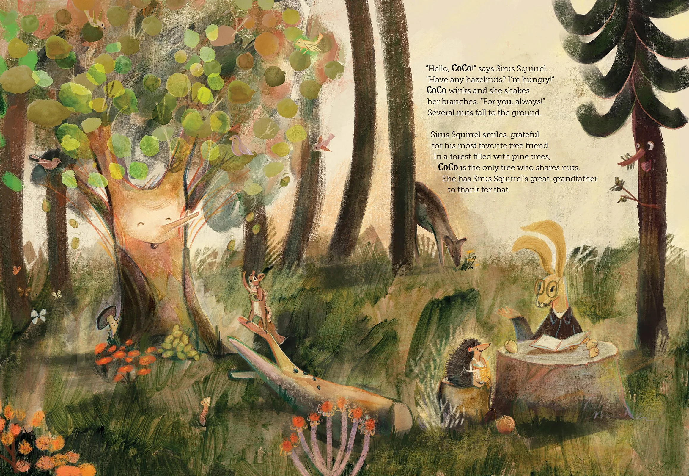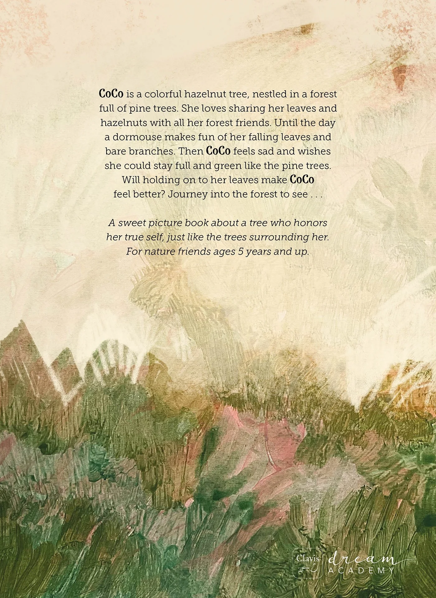 Coco is a colorful hazelnut tree, nestled in a forest full of pine trees. She loves sharing her leaves and hazelnuts with all her forest friends. Until the day a dormouse makes fun of her falling leaves and bare branches. Then Coco feels sad and wishes she could stay full and green like the pine trees. Will holding on to her leaves make Coco feel better? Journey into the forest to see…