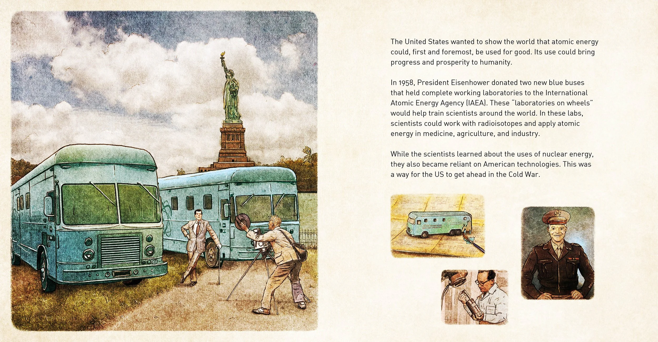 Journey into history with science and adventure! Step back to the 1950s, where world-changing innovations and the pursuit of peace take center stage. Learn how the United States once donated two blue laboratory buses to carry nuclear science across the globe with the goal of bringing hope and progress to the world after the devastation of World War II. Despite many difficulties, a team of dedicated scientists used these labs to help shape history, bridging gaps between nations in the hope of building a brighter future.